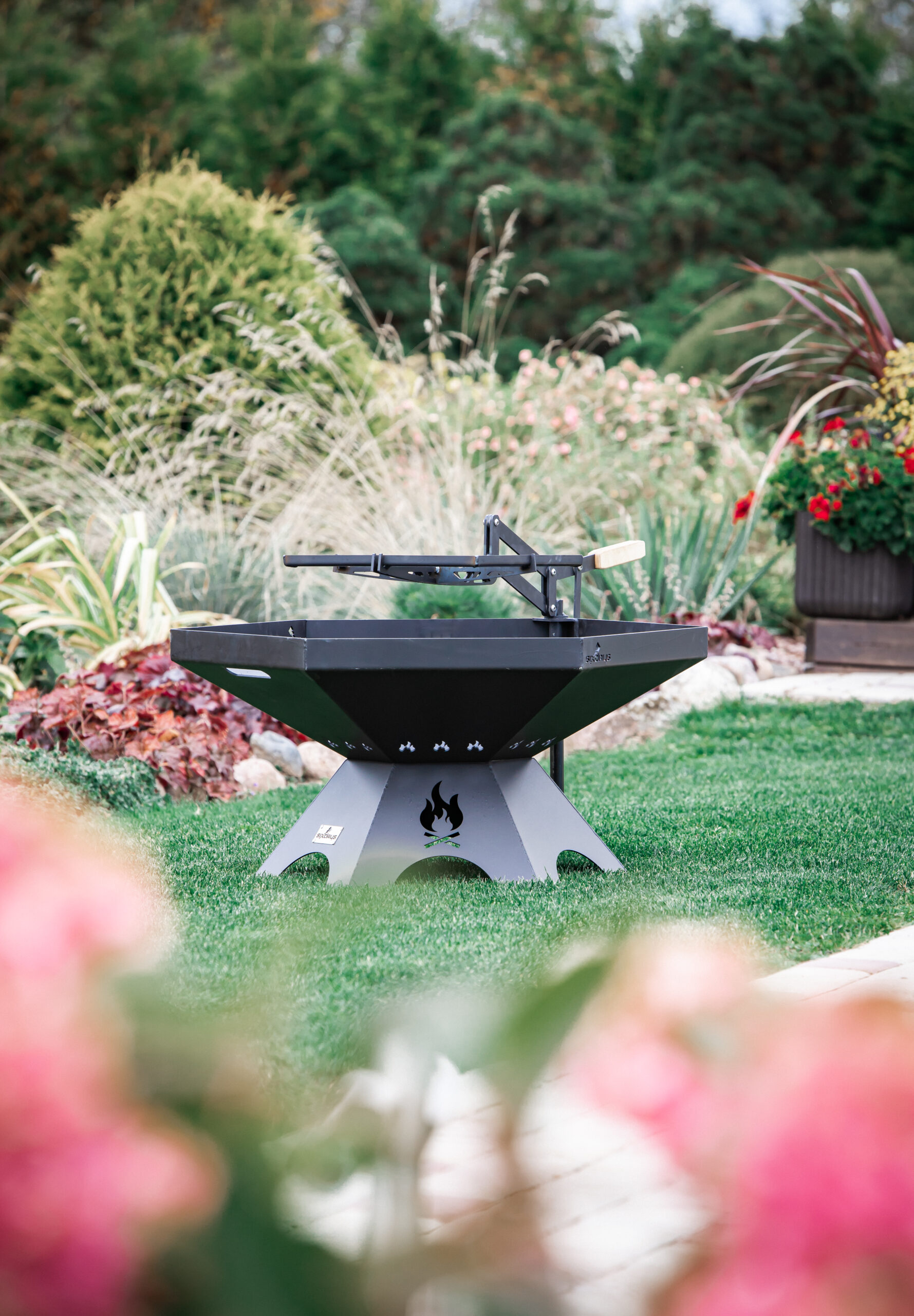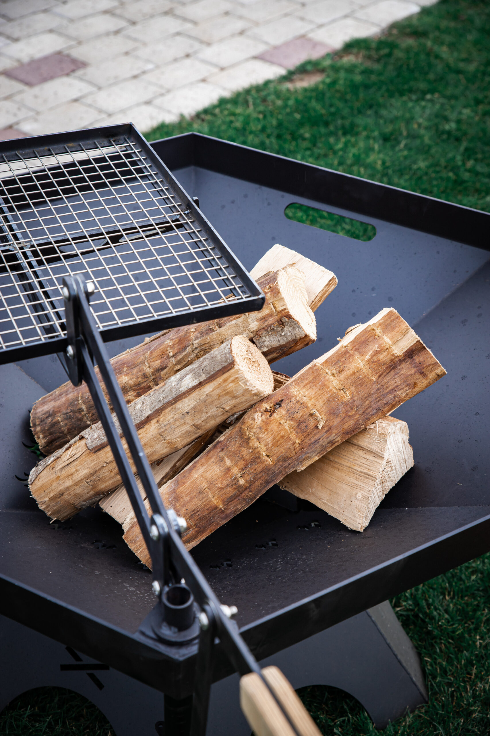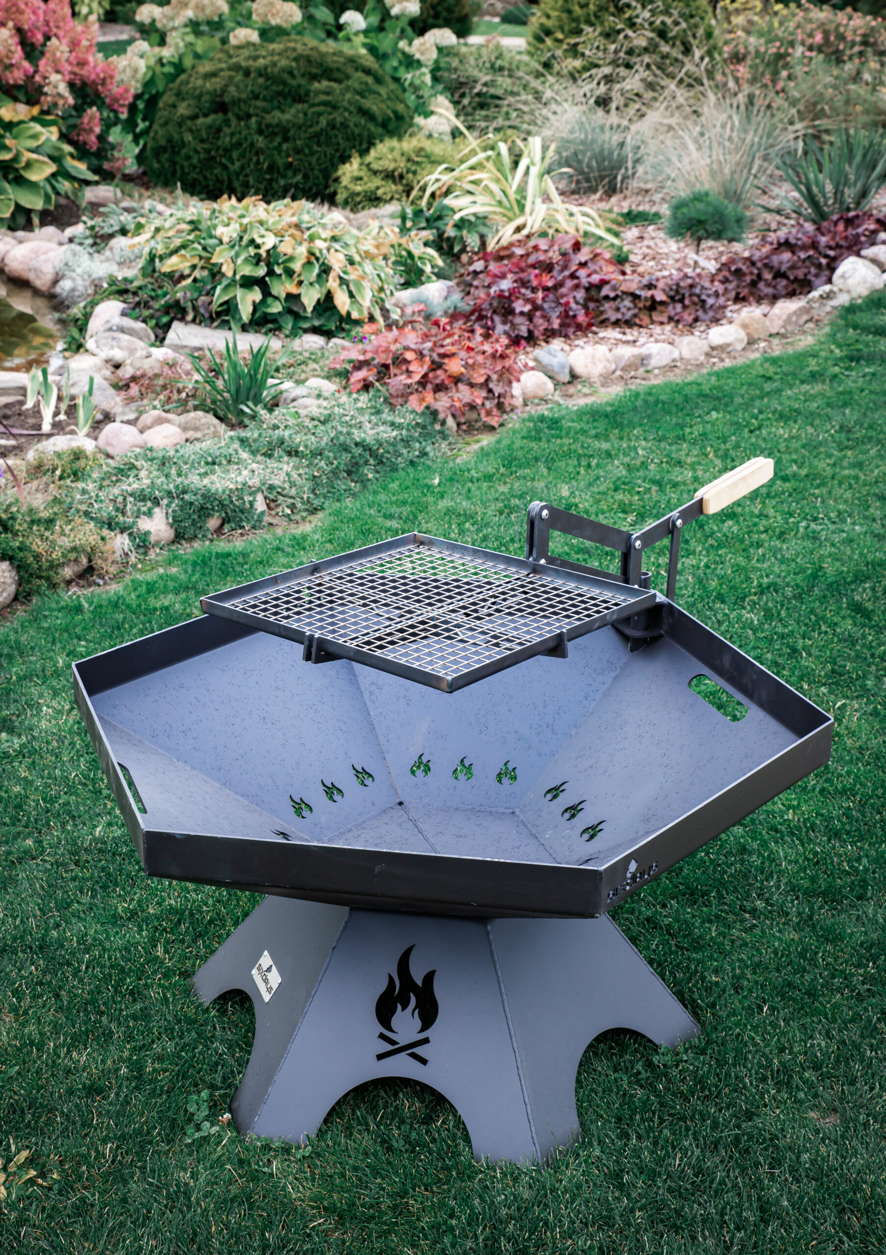 A large firepit that fits in any garden. It can be used to make a lively fire at gatherings and also to cook food on a barbecue. A special feature is the height-adjustable barbecue grill, which can be adjusted up and down or left and right. This makes it very convenient to place and remove food from the grate. The grill rack can also be replaced by a wok pan for cooking vegetables and other dishes on a live fire.