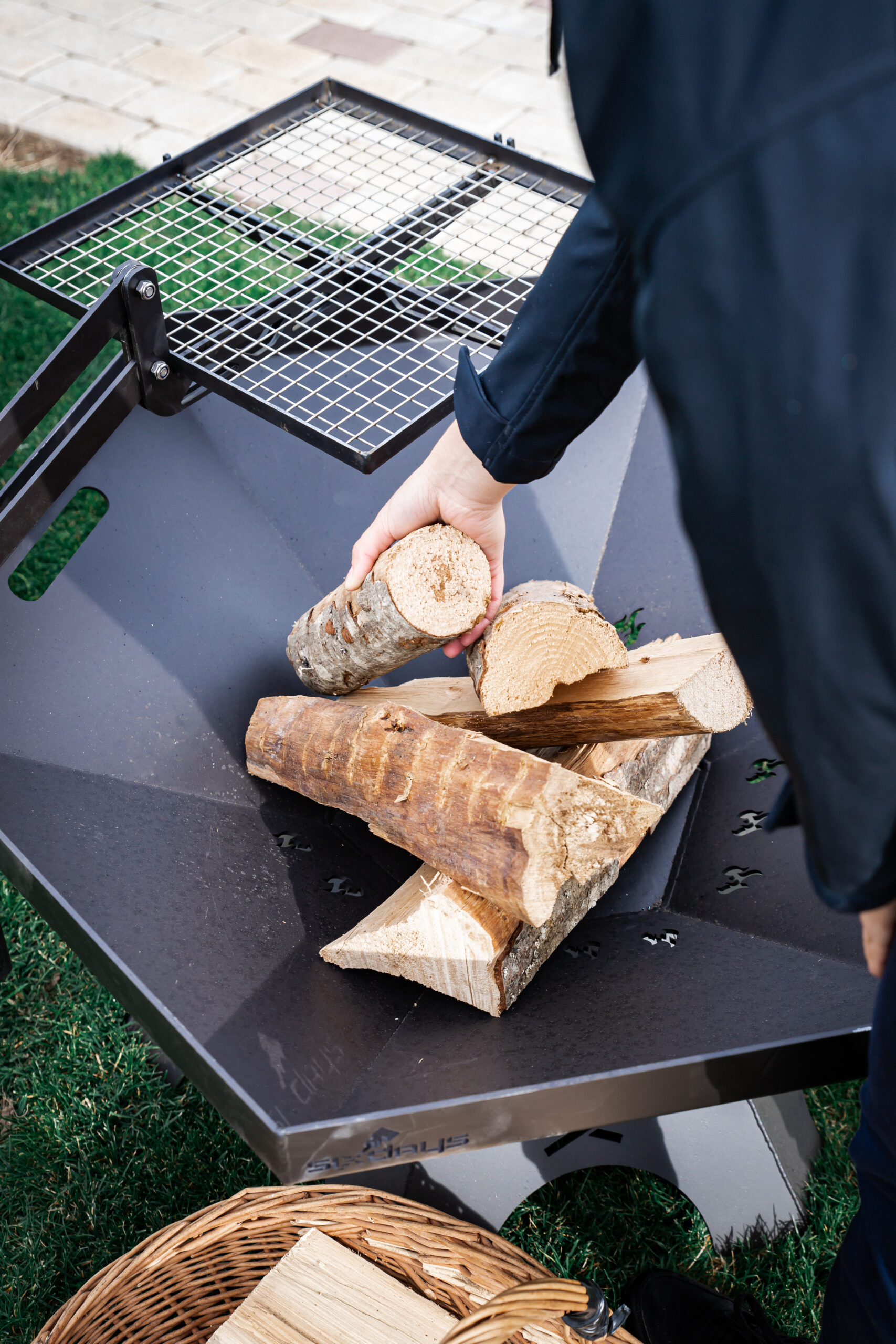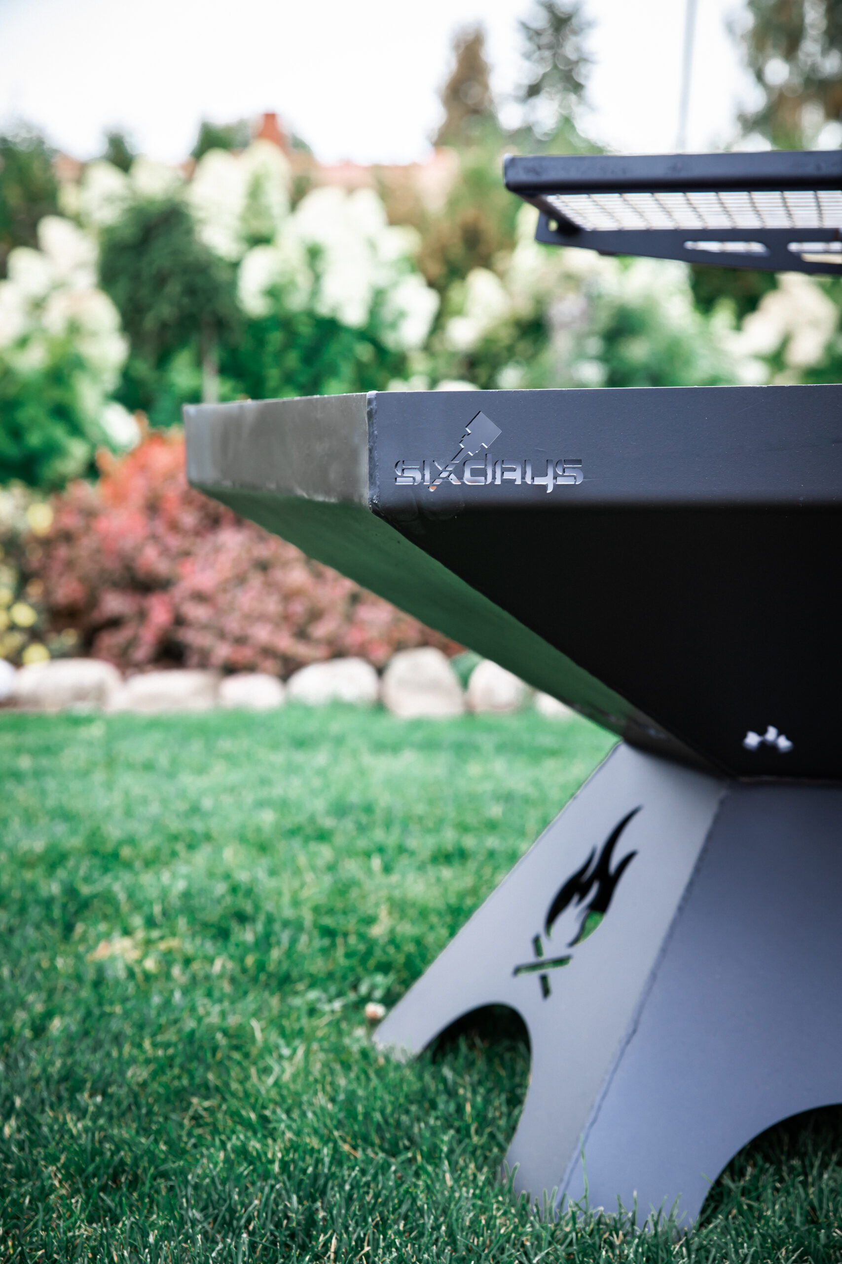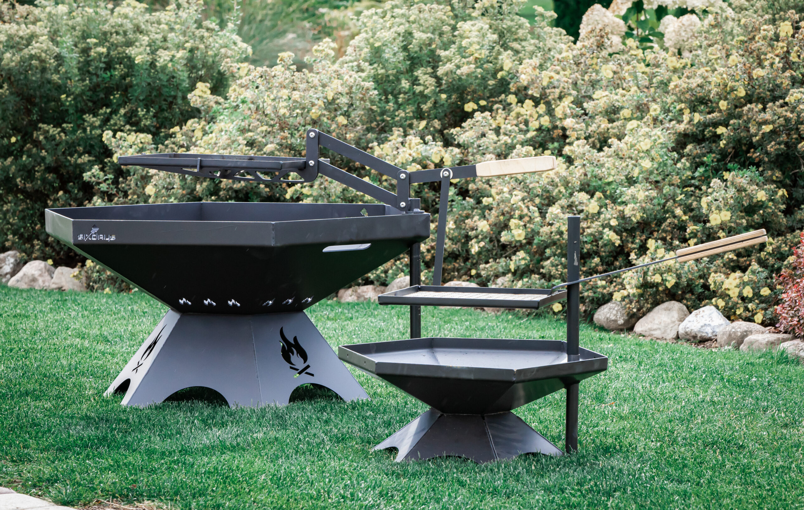 A large firepit that fits in any garden. It can be used to make a lively fire at gatherings and also to cook food on a barbecue. A special feature is the height-adjustable barbecue grill, which can be adjusted up and down or left and right. This makes it very convenient to place and remove food from the grate. The grill rack can also be replaced by a wok pan for cooking vegetables and other dishes on a live fire.