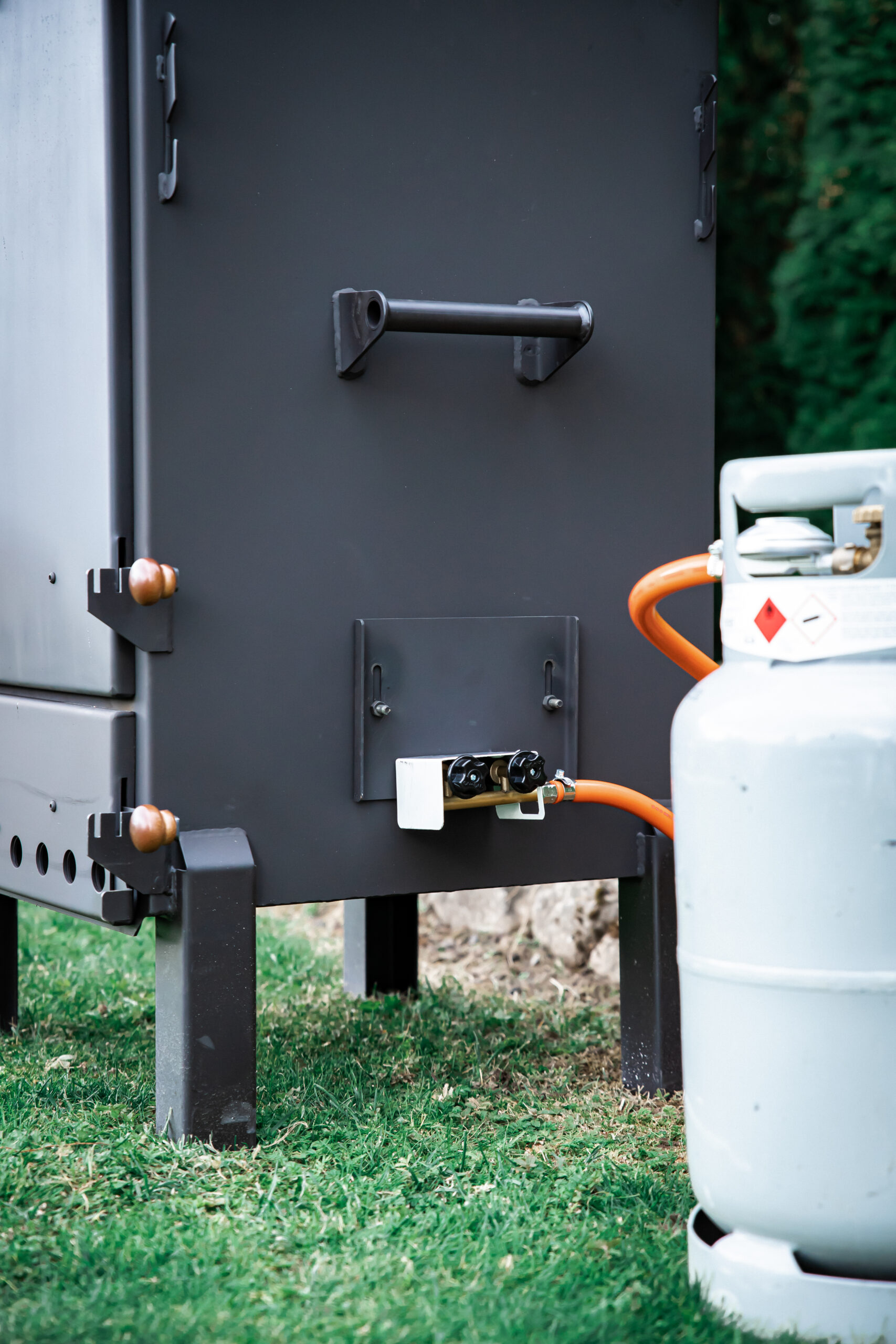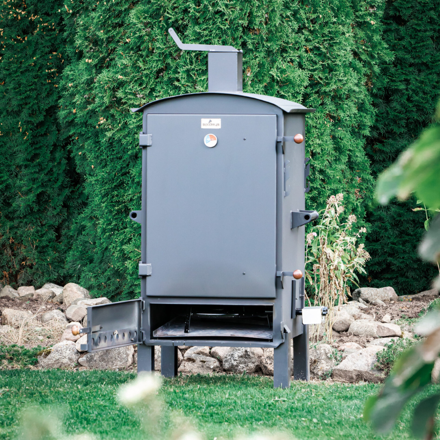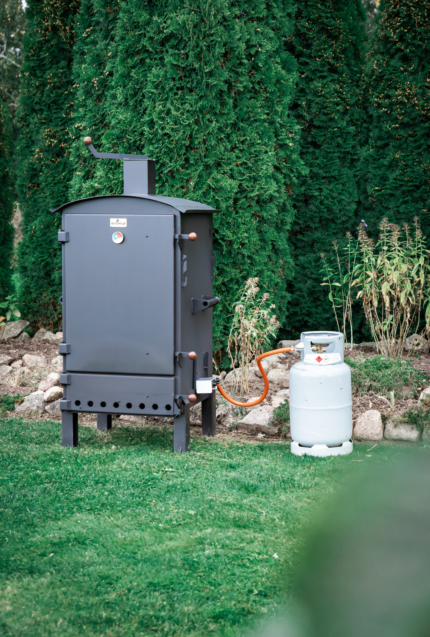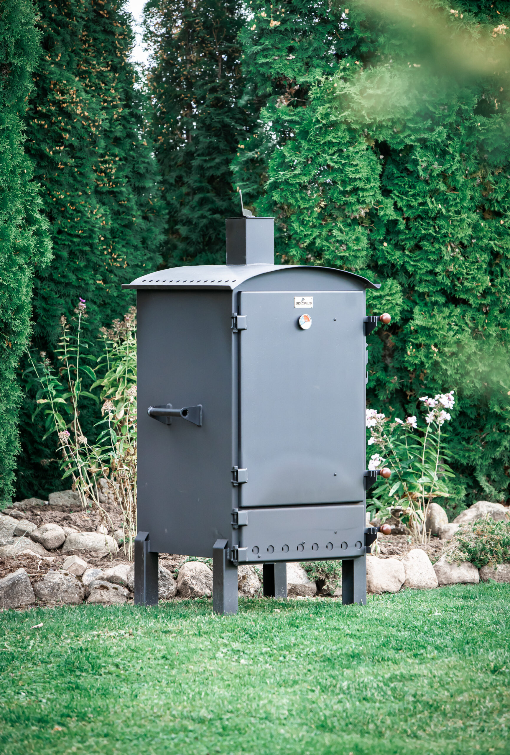 Smoke stove with two-chamber system, where the smoke from the heating is exhausted through the roof vents. The smoke and water vapour in the cooking chamber can be controlled by a separate chimney flue. A gas heater can be purchased as an optional extra, making the preparation of delicious smoked products much more convenient. When using a wood-burning stove, the temperature in the cooking chamber must be carefully monitored to keep it within the right range, but with a gas solution the temperature is very stable.