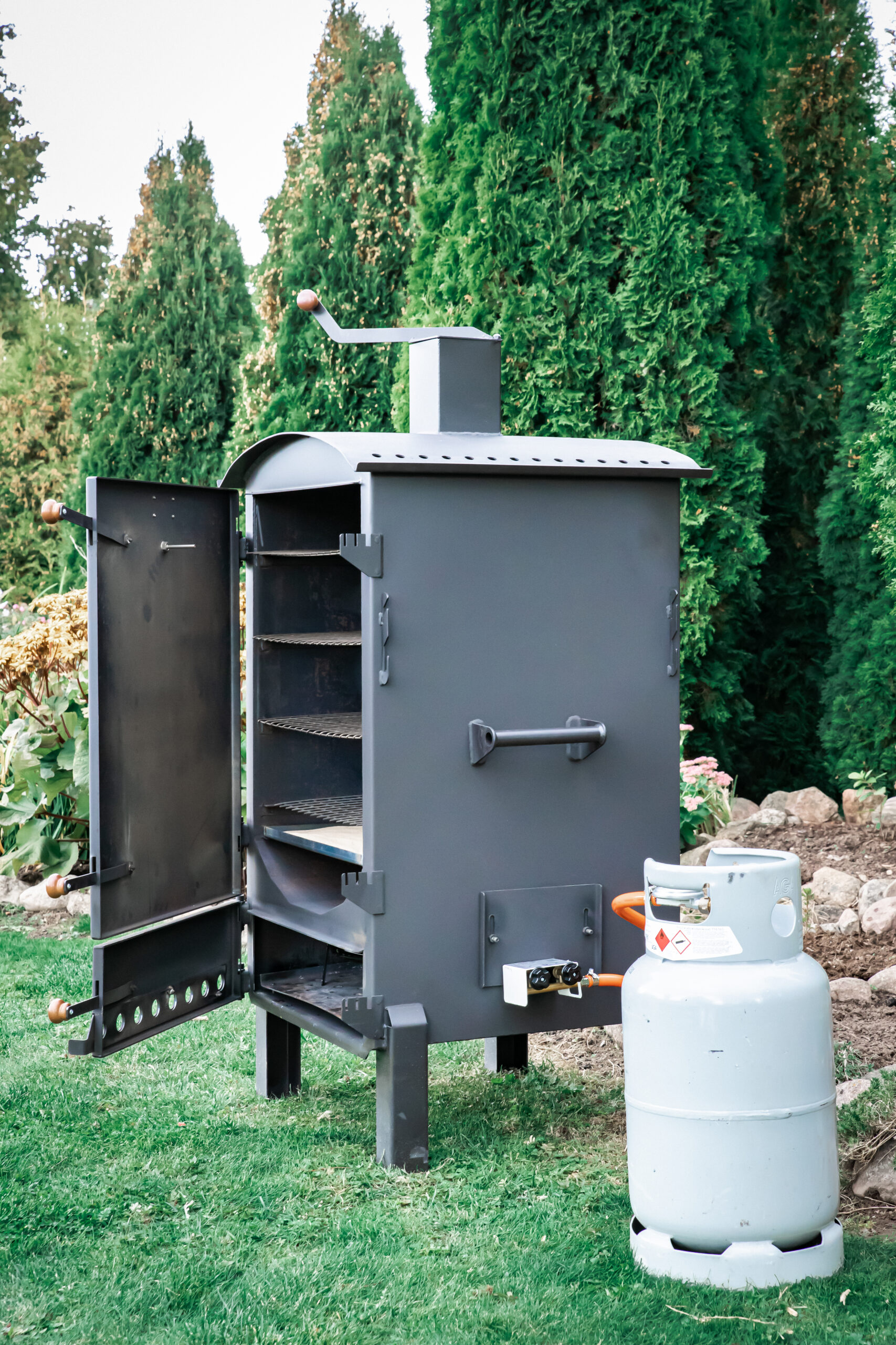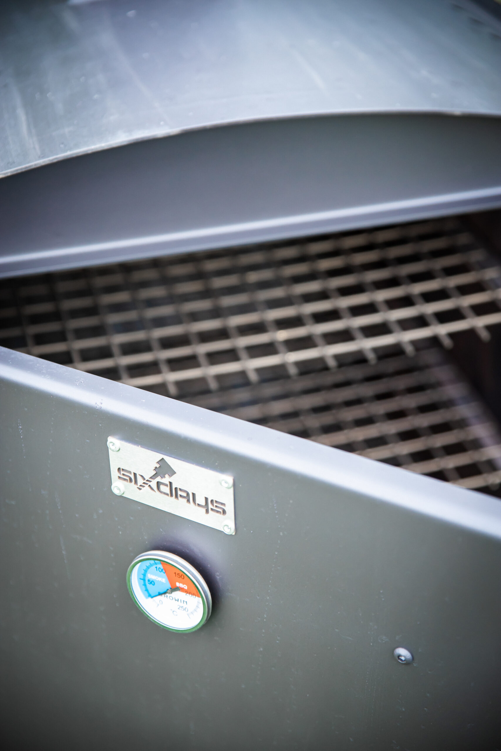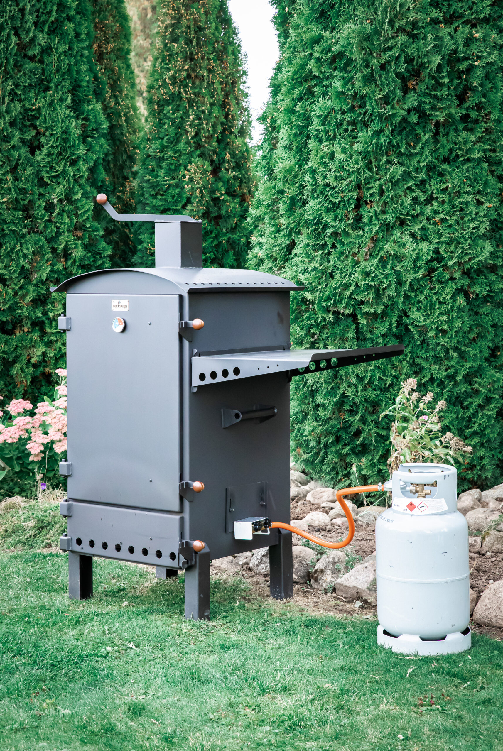 Smoke stove with two-chamber system, where the smoke from the heating is exhausted through the roof vents. The smoke and water vapour in the cooking chamber can be controlled by a separate chimney flue. A gas heater can be purchased as an optional extra, making the preparation of delicious smoked products much more convenient. When using a wood-burning stove, the temperature in the cooking chamber must be carefully monitored to keep it within the right range, but with a gas solution the temperature is very stable.