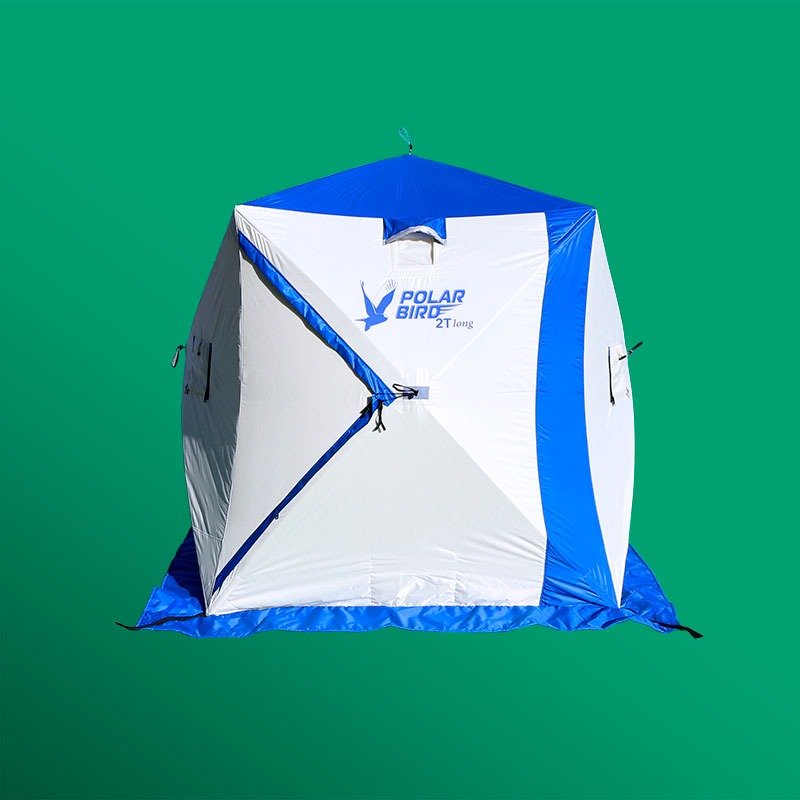 Insulated tents for ice fishing and all year round camping! Our winter tents are developed by seasoned specialists and passionate ice fishing enthusiasts. These tents have been tested not only in the harsh Siberian winters but also on hard water in the USA and Canada. They also have been quickly gaining popularity with Scandinavian clients. Polar Bird winter tents have a large number of benefits: Insulation – the fabric of these tents consists of three layers. Using special technology, the layers of the fabric are securely laminated together and thanks to this, no quilting is required and the amount of stitching in the fabric is minimal. And because of no quilting, there are virtually no cold bridges in the fabric which results in maximum thermal efficiency. Keep in mind – thermal efficiency works in the cold as well as heat. If in the wintertime, the tent stays warm then in the summer, it will keep outside heat away and your tent nice and cool. Floor – foldable and made from EVA foam, the floor is light and easy to transport. It’ll keep your feet warm and the moisture out. Its securely fastened on the perimeter with double Velcro and in case you need to move your tent (which does happen during ice fishing), no need to fold your tent together – just grab it by the corner and move it to a better place. Functionality and ease of use – thanks to pop-up technology – pitching the tent is easy and fast. For storage and transport, it also folds into a nice and compact package. The tents have ventilation openings and windows, big doors for convenient entry and exit and all of them are prepared for the use of a camping stove. Innovative materials of high quality – our pop-up tents have no separate rods and arcs to be installed. Every wall gets set up in one easy motion. Built-in fibreglass poles are manufactured in house and are virtually unbreakable.